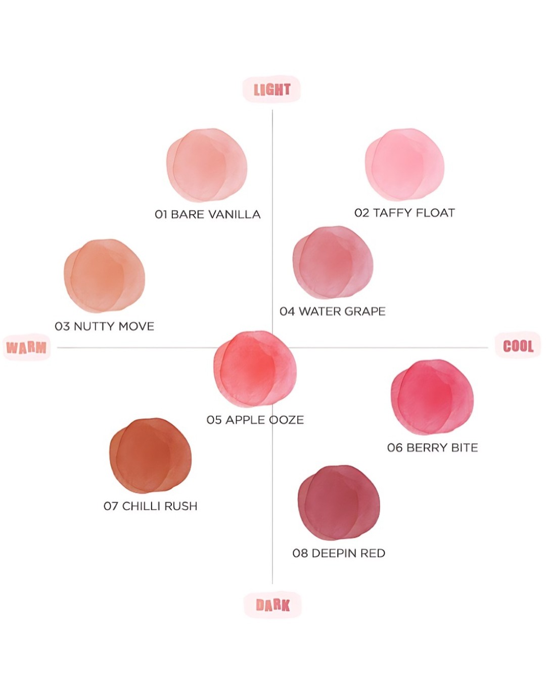 Tinta labial coreano que ofrece un acabado natural y delicado, con una textura ligera como el agua que se desliza suavemente sobre los labios.