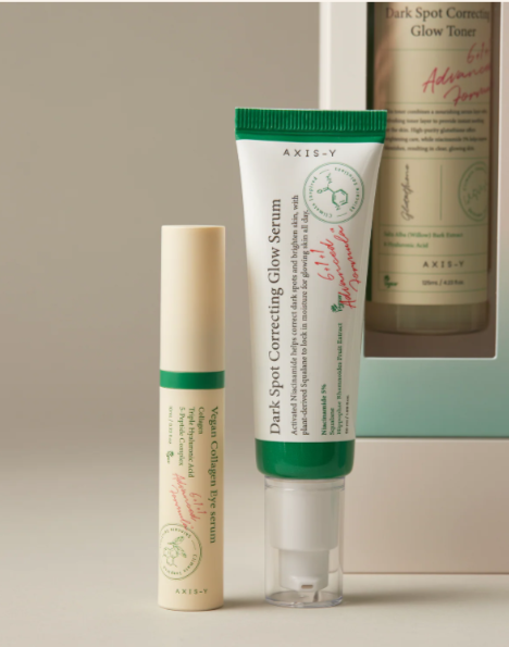 El set combina tres productos dedicados a iluminar, corregir manchas oscuras y mejorar la textura general de la piel, junto con un espejo compacto de edición especial. El Glow Toner exfolia suavemente mientras unifica el tono; el Collagen Eye Serum hidrata y reafirma el contorno de ojos con una fórmula vegana ligera; y el Glow Serum se enfoca en aclarar manchas y aportar una luminosidad natural gracias a sus componentes despigmentantes. Todo el set está diseñado para trabajar en conjunto y potenciar una piel más clara, uniforme, hidratada y radiante.